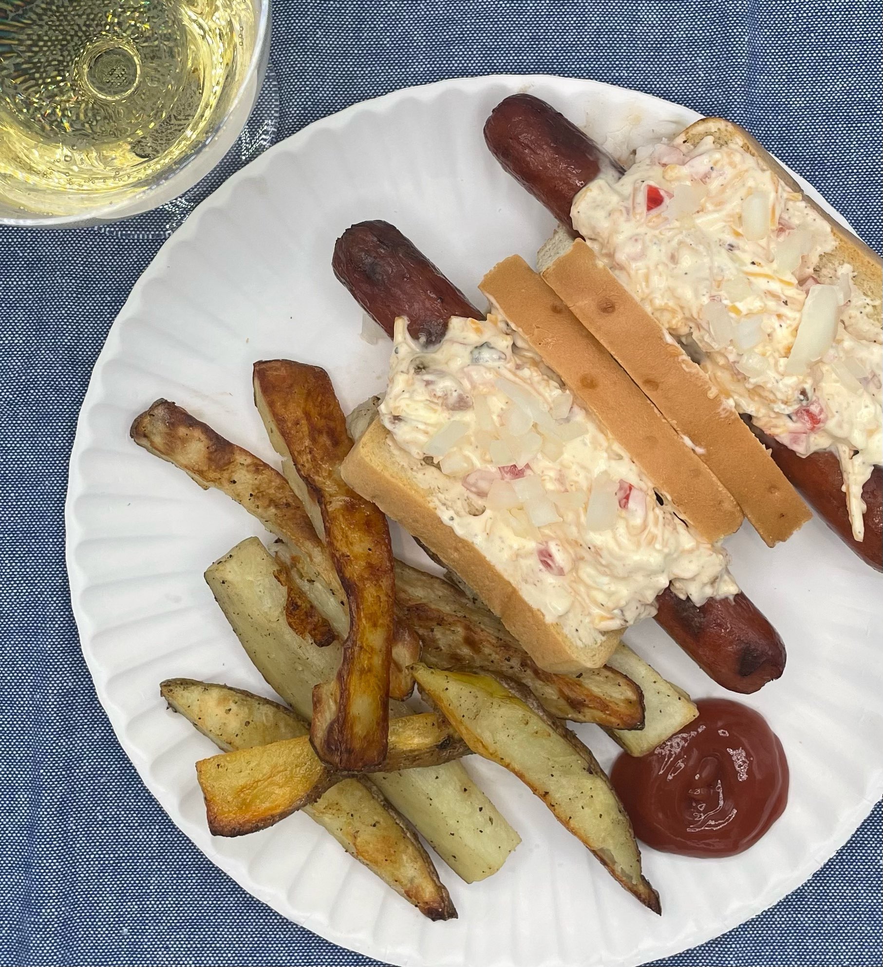 6) Finish and Serve - While hot dogs cook, toast slices of sourdough bread in toaster. When hot dogs and fries are finished cooking, add sausages to slices of sourdough, wrapping bread around hot dogs. Top hot dogs with pimento cheese and serve, with fries and leftover onions along side, plated or family style. Enjoy!!